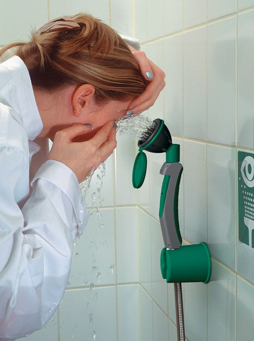 Handaugendusche mit B-Safety Hochleistungsbrausekopf, integrierter automatischer Mengenregulator und Rückflussverhinderer · selbständig öffnende Staubabdeckkappe · Volumenstrom 7 l/min pro Brausekopf · Wasseranschluss:1/2 Zoll-IG · für Wand-/Tischmontage · erfüllt DIN 15154-2