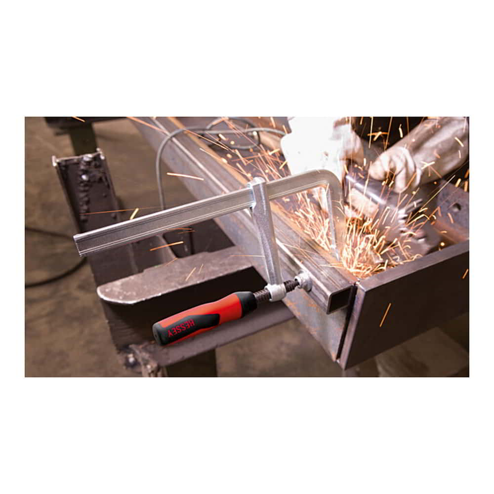 Spannkraft bis zu 6.000 N · 20 % mehr Spannkraft pro Spindelumdrehung durch optimiertes Schienenprofil · höchste Sicherheit durch geradlinige Kraftübertragung am Gleitbügel · vergüteter Gleit- und Festbügel für federndes und elastisches Spannen · hochwertiger 2-Komponenten-Kunststoffgriff · werkzeuglos wechselbare Druckplatten (ab 80 mm Ausladung)