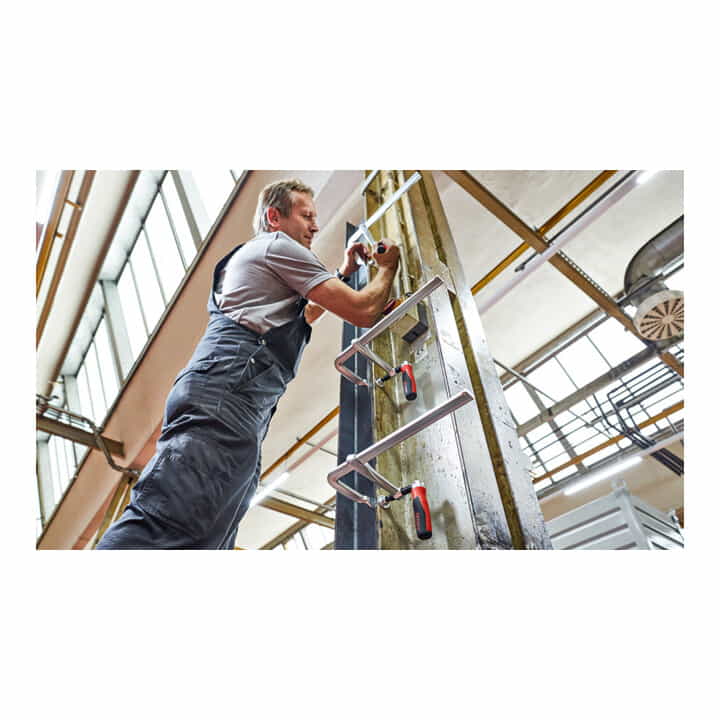 durch den 2-Komponenten-Klappgriff für zusätzliche Hebelwirkung beim Anziehen · kann um 90° umgeklappt werden und 360° gedreht werden · ohne an der Schiene anzustossen · für schnelles und komfortabeles Arbeiten auch an schwer zugänglichen Stellen · werkzeuglos wechselbare Druckplatten