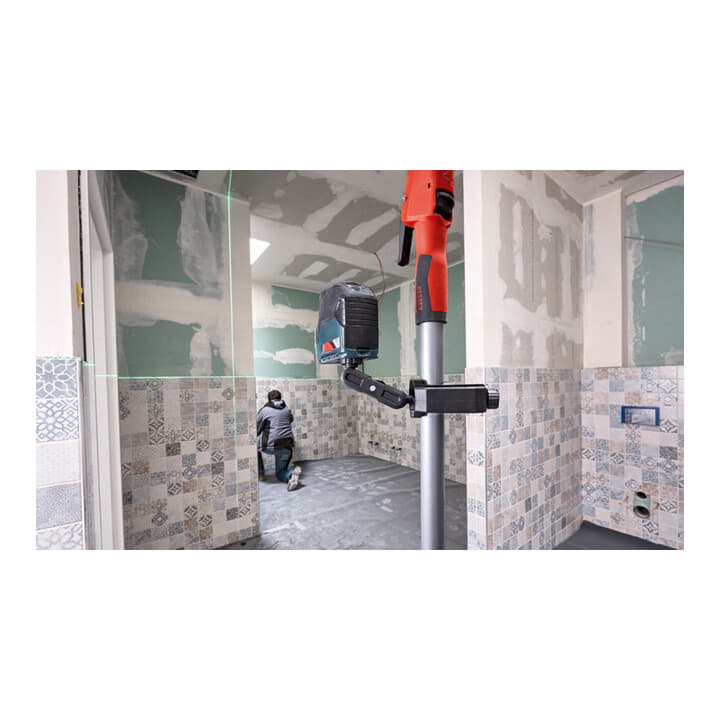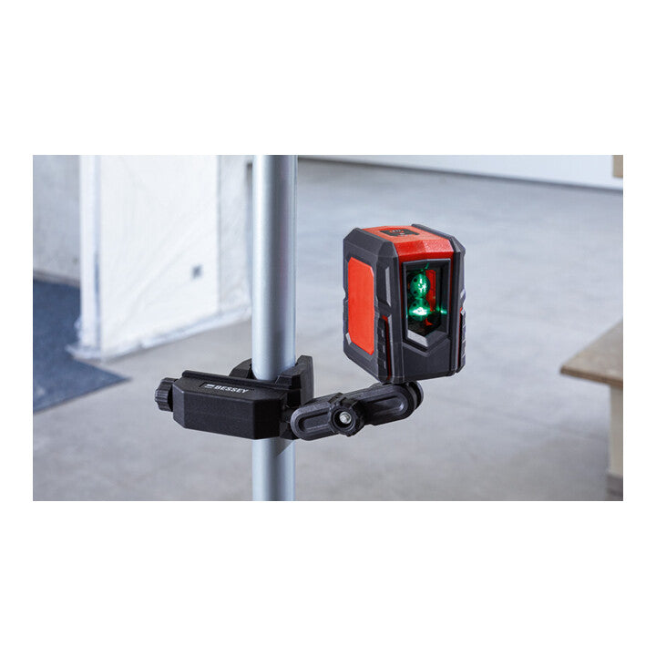 Halterung mit 1/4″ Gewindeaufnahme zum Fixieren von Hilfsmitteln wie z.B. Laser · Kamera · Bauleuchte Werkzeuglos einsetzbar an runden (0-45 mm) sowie eckigen (0-55 mm) Trägerteilen wie z.B. Decken- und Montagestützen · Profilen · Leitern L-Drehhalterung mit zwei Rotationsachsen: 360° neben Befestigungsklemme · 180° an Gewindeaufnahme SB-verpackt