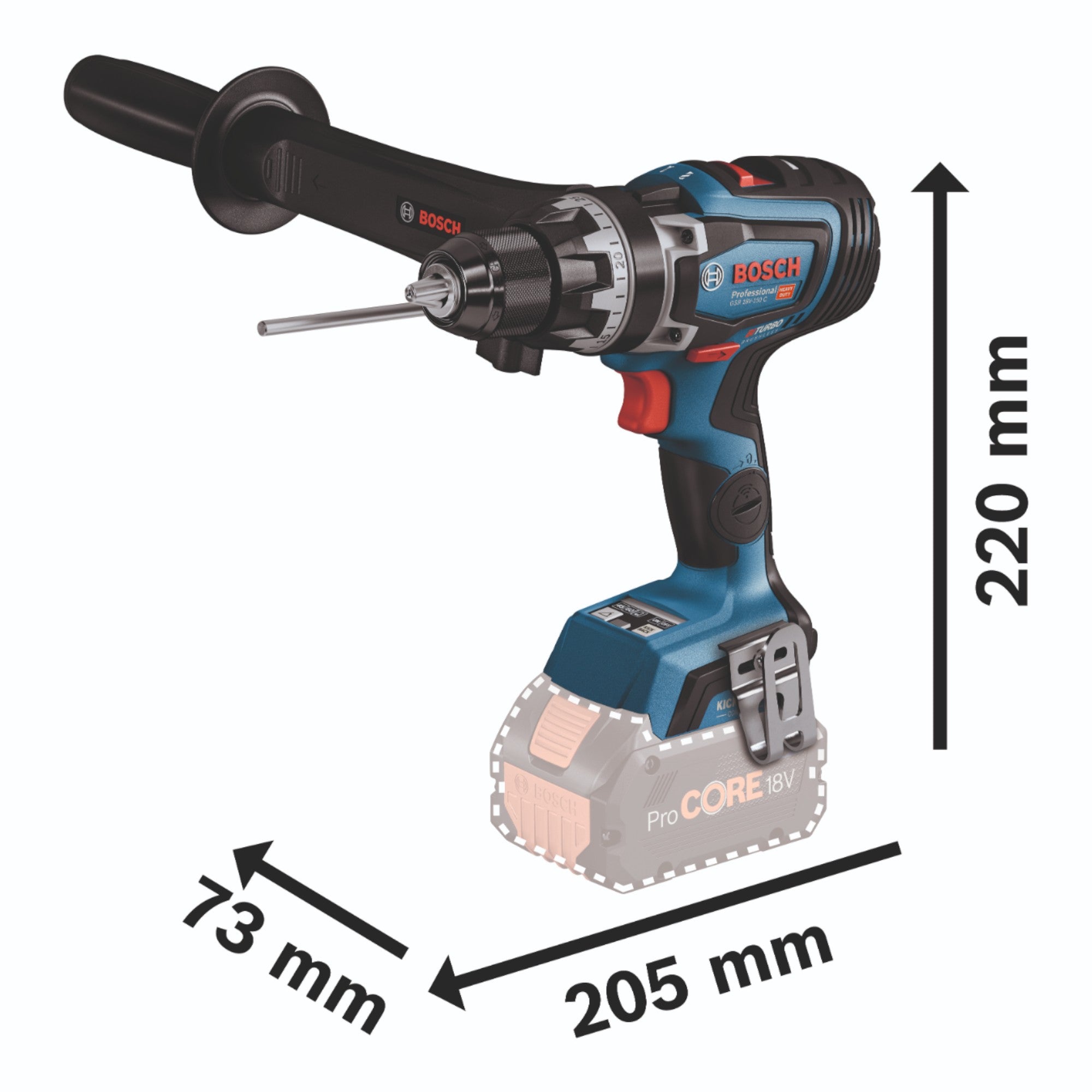 Der Bosch GSR 18V-150 C Professional Akku Bohrschrauber besticht durch seine 150 Newtonmeter Drehmoment gepaart mit der Biturbo Technologie. Des Weiteren besitzt er die präzise Electronic Angle Detection, diese gewährleistet bei langen Schrauben immer den richtigen Winkel. Darüber hinaus ist die KickBack Control verbaut. Das robuste Metallbohrfutter und Metallgetriebe versprechen eine lange Lebensdauer und viel Freude bei der Nutzung. Darüber hinaus ist das Bosch Connectivity Modul ( nicht im Lieferumfang ) kompatibel. Der GSR 18V-150 C Professional zeigt optimale Ergebnisse beim Schrauben und Bohren in Holz und Metall, besonders beim Bohren großer Durchmesser, z. B. Lochsägen bis 150 mm. Selbstverständlich ist eine LED Leuchte verbaut. Eines der Highlights der Maschine sind die drei Drehmomenteinstellungen. Diese sind im weichen Fall 84 Nm, im harten 100 und im Maximalbereich 150 Nm. Wichtig zu wissen: Biturbo Geräte müssen mit ProCore Akkus ab 5,5 Ampere betrieben werden. Bei kleineren Akkus ist die Performance des Gerätes lizenziert. Die Firma Bosch Professional ist ein führender Hersteller für Elektrowerkzeuge aller Art, der sich durch seine lange Tradition und seine hohe Verarbeitungsqualität auszeichnet.