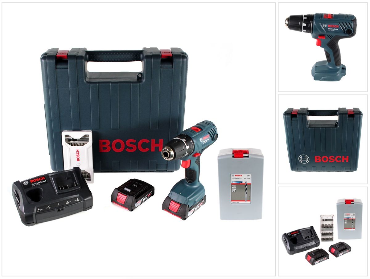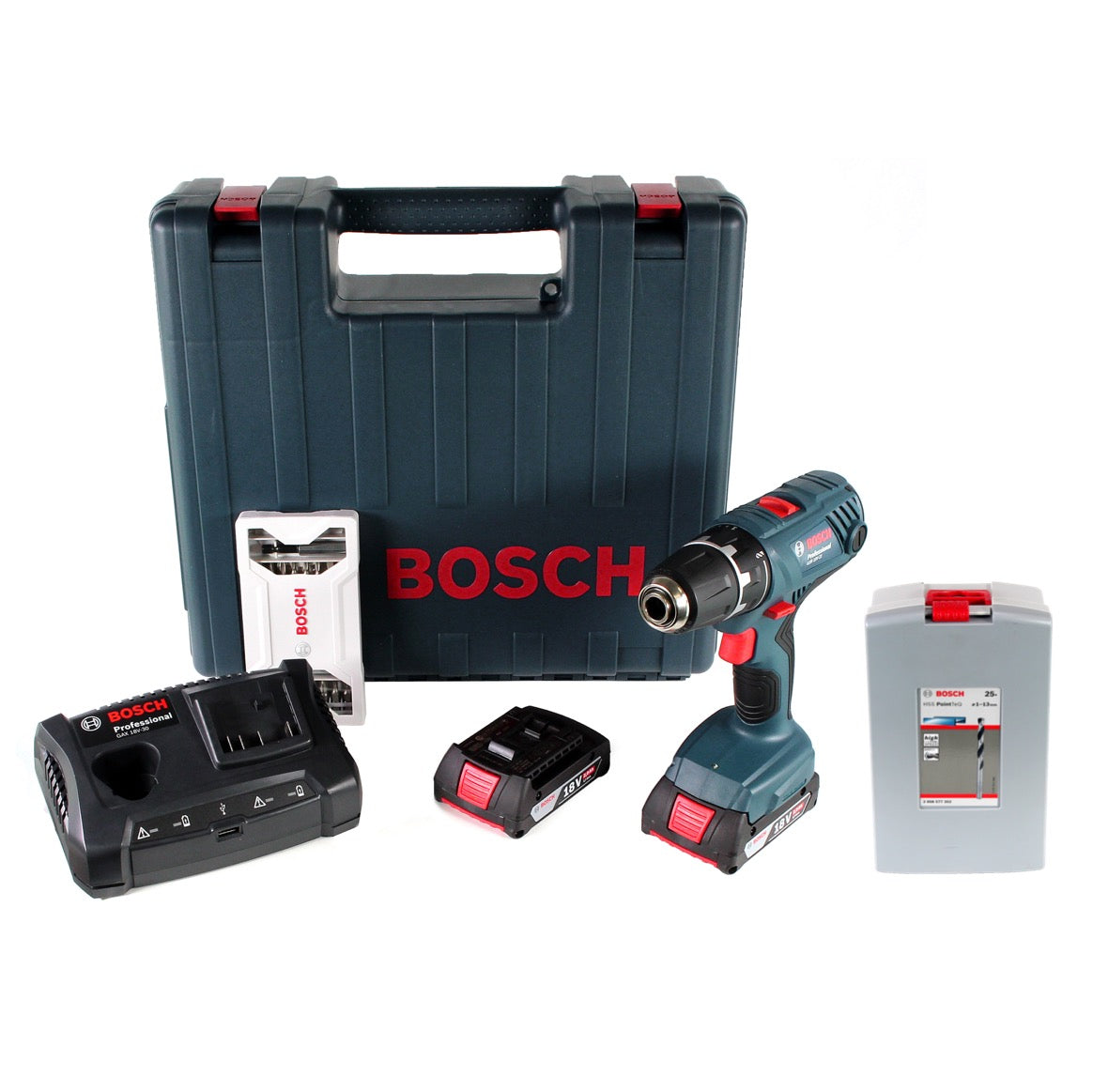 Bosch Professional GSR 18V-21 Akku Bohrschrauber 18V 55Nm + 2x Akku 2,0Ah + Ladegerät + Spiralbohrer Set + Bit Set + Koffer