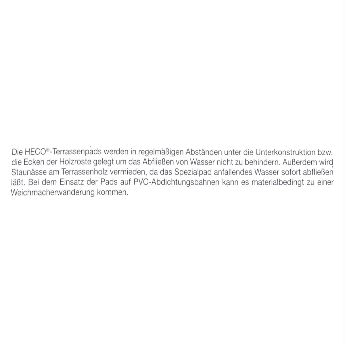 Die HECO Terrassenpads bieten ein breites Spektrum für den konstruktiven Holzschutz bei Terrassenunterbauten auch auf unebenem Untergrund. Eine spezielle Körnung und die optimierte Anordnung des Gummigranulates verhindert Staunässe, da ein sehr schnelles Abfließen des Wassers vom Holz weg bei gleichzeitig stabiler Lagerung der Terrassenkonstruktion ermöglicht wird. Des weiteren trägt es zur Trittschalldämmung bei.