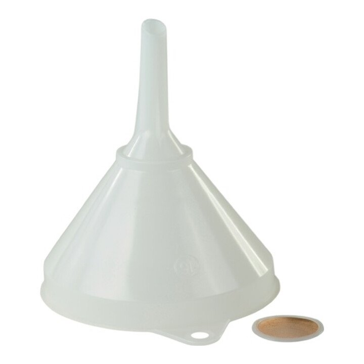 HD-Polyethylen · natur · lebensmittelbeständig · mit Edelstahlgewebesieb · mit Aufhängeöse, Entlüftungsrippen und Überlaufrand · Auslaufende Ø 17 mm