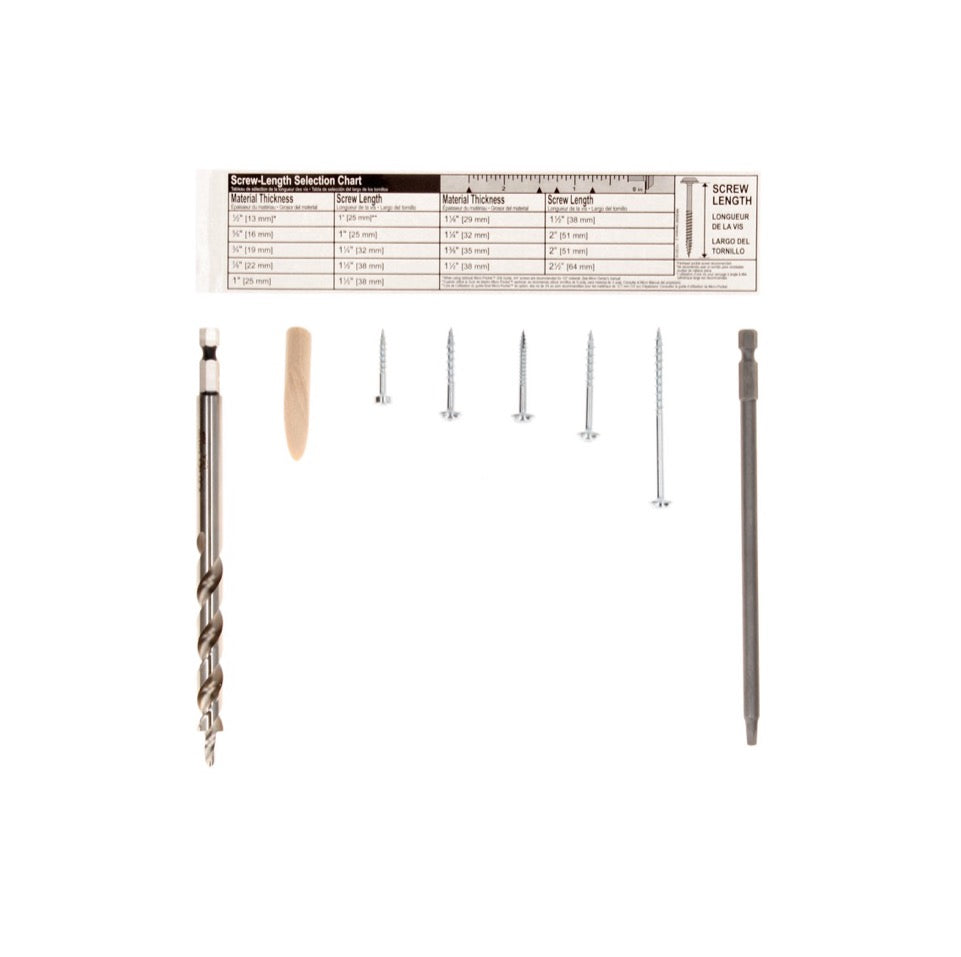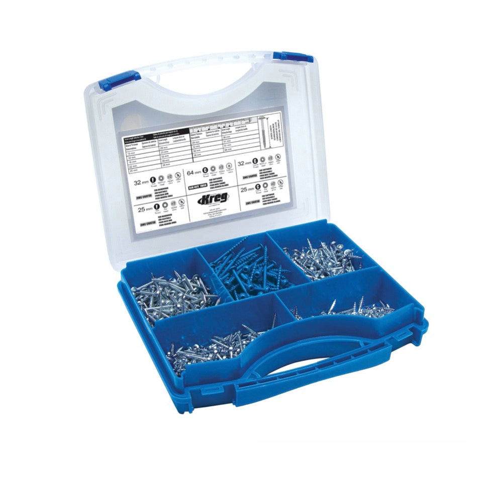 Das Jig K5 ist ein Bohrschablonen-Set aus glasgefülltem Nylon, Polymer und Stahl aus dem Hause Kreg. Es besitzt einen Spannmechanismus, der ohne Werkzeug oder Muttern schnell an die Werkstückdicke angepasst werden kann. Die großen Stützflügel halten des Werkstück stabil und ruhig.  Sie sind von innen hohl und bieten auf diese Weise praktischen Stauraum für Bits und anderes Zubehör. Der Staubsammelanschluss ist schwenkbar und direkt mit einem Sauger verbindbar, der Bohrführungsblock hat einen gefederten Anschlag und die Möglichkeit der Montage. Die Nutzung ist erstaunlich einfach: Man nimmt eine Schraube basierend auf der Dicke des Holzes, stellt den Anschlagring mit dem Bohrer-Einstellblock ein, zieht am gefederten Stift, um den Bohrungsblock einzustellen und setzt dann die Ratschenklemme ein. Diese lässt man einfach über das Werkstück gleiten und hebt den Griff an, bis zwei Klicks zu hören und zu fühlen sind. Nun ist die Klemme so lange eingestellt, bis auf eine andere Materialdicke gewechselt wird. Nun kann die Bohrung durch die Bohrführungen aus gehärtetem Stahl begonnen werden und der schnellen Anfertigung auch größerer Werke steht nichts mehr im Wege. Der Systainer aus lichtgrauen ABS-Kunststoff rundet mit den passgenauen Schaumstoffeinlagen das Gerät ab und sorgt für den geräuscharmen und sicheren Transport zu jeder Baustelle. Kreg ist bekannt für seine Innovativen Lösungen bei Systemwerkzeugen. Das Kreg-Blechschrauben-Starterset bietet ein passgenaues Sortiment an Kreg-Schrauben für Kreg-Holzverbindungsprojekte. Das Blechschrauben-Starterset enthält 675 Kreg-Schrauben in 5 gängigen Größen, sodass es die perfekte Wahl ist, wenn Sie Ihre erste Kreg-Schablone kaufen und gerade erst mit dem Bauen beginnen oder auf der Suche nach einem Sortiment sind, das perfekt für Haushalt-Reparaturen geeignet ist. Dieses Set enthält fünf der beliebtesten Kreg-Blechschrauben, die in einer langlebigen, leicht zu tragenden Box aufbewahrt sind. Dies ist ein großartiges Starter-Set für jeden Anfänger in der Kreg-Holzverbindung. Alle Schrauben sind in einer haltbaren, unterteilten Box aufbewahrt.