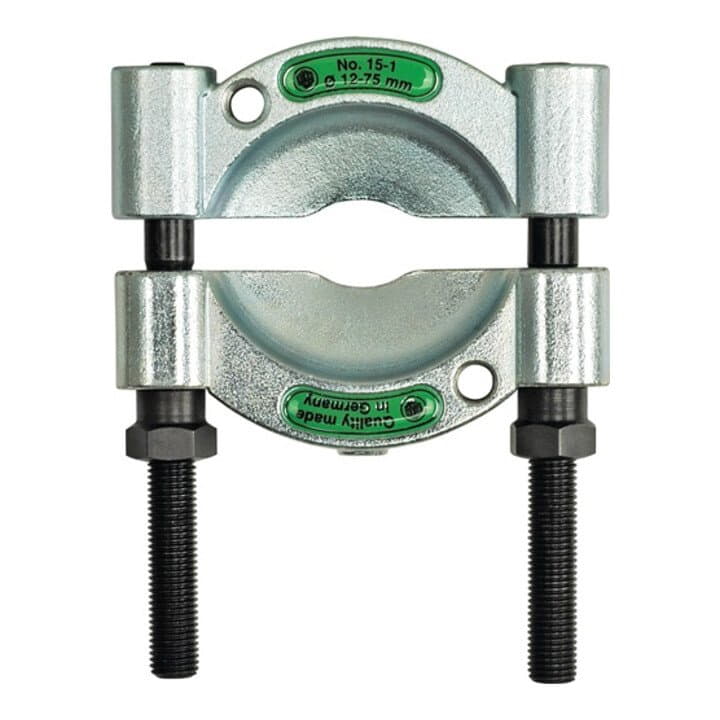 Anwendung: zum Abziehen von Kugellagern, Rollenlagern, Innenringen und anderen bündig aufsitzenden Teilen · die scharfen Schneiden ermöglichen das Abziehen bündig aufliegender Teile, wo 2- und 3- armige Abzieher unanwendbar sind (Abb. 1) · das Spannen der Trennbacken erfolgt durch gleichmäßiges Abziehen der Muttern auf den Seitenbolzen Arbeitsweise: das Abziehen erfolgt durch Anziehen der Spindel gegen das Wellenende (Abbildung 2 und 3), bei den größeren Abziehvorrichtungen ist auch hydraulische Arbeitsweise möglich Arbeitsweise mit Hydraulik (Abbildung 4): (Hydraulik gehört nicht zum Lieferumfang) mit dem Schlüssel (b) die Spindel der Hydraulik in das Gewinde der Traverse der Abziehvorrichtung schrauben · bis sich das Druckstück fest gegen die Welle presst, dann durch Drehen der oberen Spindel (a) die Hydraulik in Tätigkeit setzen · Achtung: die Abbildungen 2 und 3 zeigen die Trennvorrichtung in Kombination mit der Abziehvorrichtung Art.-Nr. 4157 490 000, 4157 490 001, 4157 490 002, 4157 490 003 (gehört nicht zum Lieferumfang) die Abbildung 4 zeigt die Trennvorrichtung in Kombination mit der Abziehvorrichtung Art.-Nr. 4157 490 000, 4157 490 001, 4157 490 002, 4157 490 003 und einer Hydraulikspindel (Abziehvorrichtung und Hydraulikspindel gehören nicht zum Lieferumfang) Hydraulikspindel bitte separat anfragen