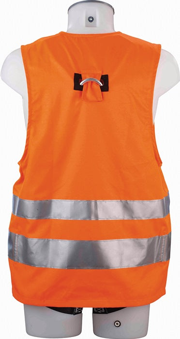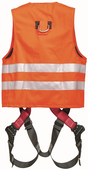 EN 361, EN20471 · Auffanggurt MAS40 Variante Quick integriert mit Warnweste in leuchtorange · Auffangöse hinten durch Klett gegen Verrutschen gesichert · Gurtdurchführungen für Brustauffangöse und Beinbegurtung