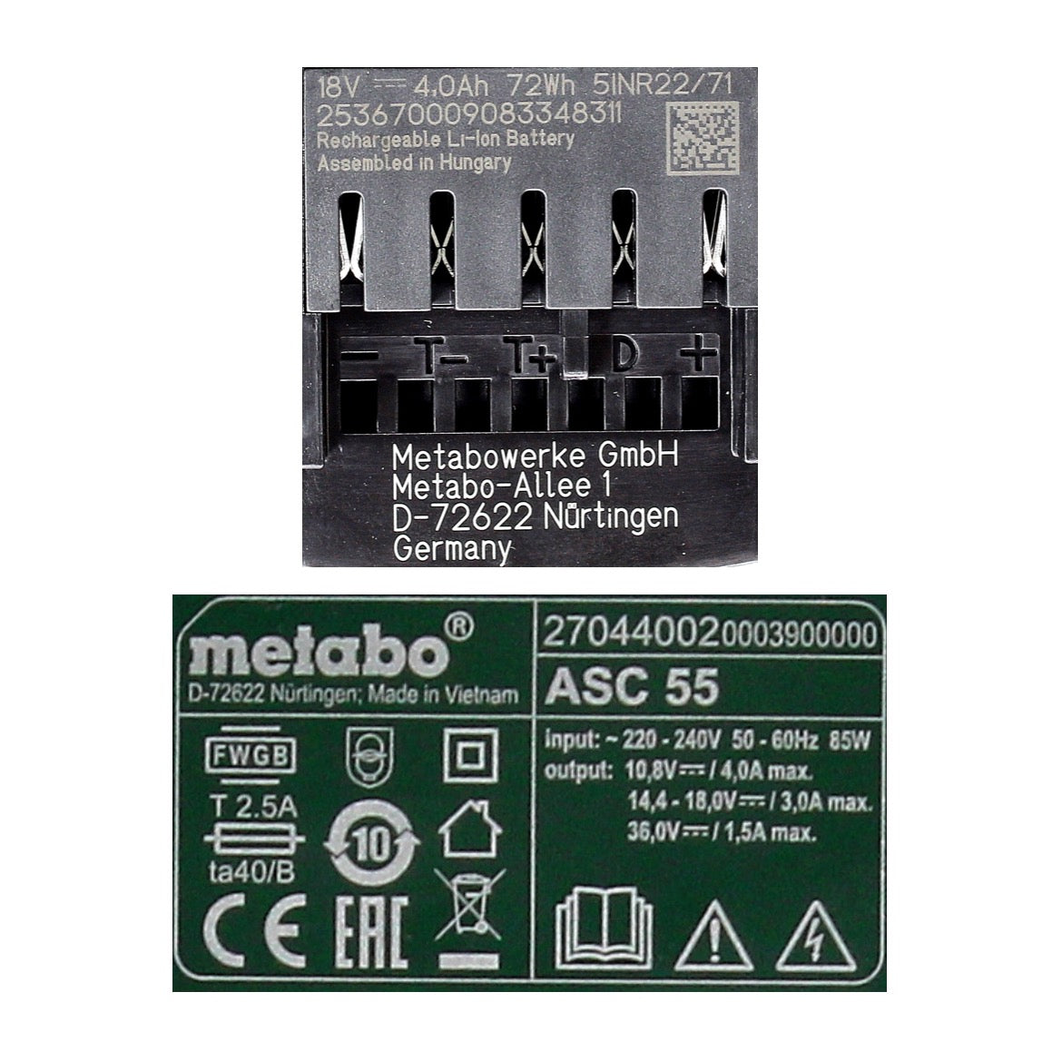 Metabo Akku Basis Set 18V mit 2x Akku LiHD 4,0Ah ( 625367000 ) + Ladegerät ASC 55 ( 627044000 ) Folgemodell vom ASC 30-36