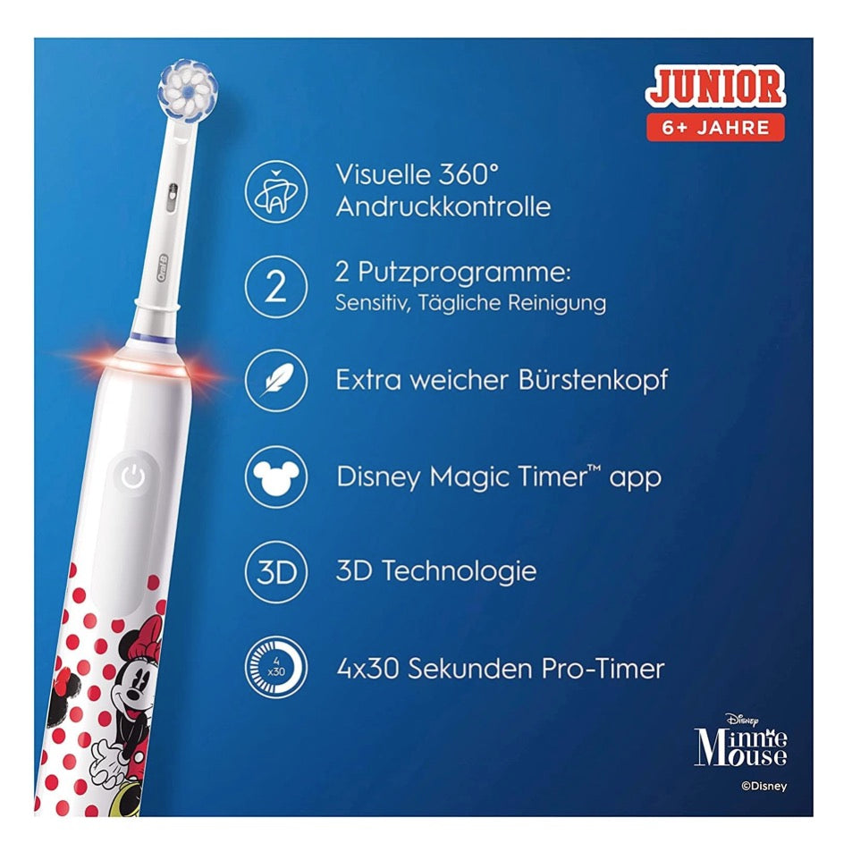 Oral-B Junior Minnie Mouse Elektrische Zahnbürste Electric Toothbrush für Kinder ab 6 Jahren 360° Andruckkontrolle 2 Putzmodi inkl., Timer, weiß + 2 Aufsteckbürsten