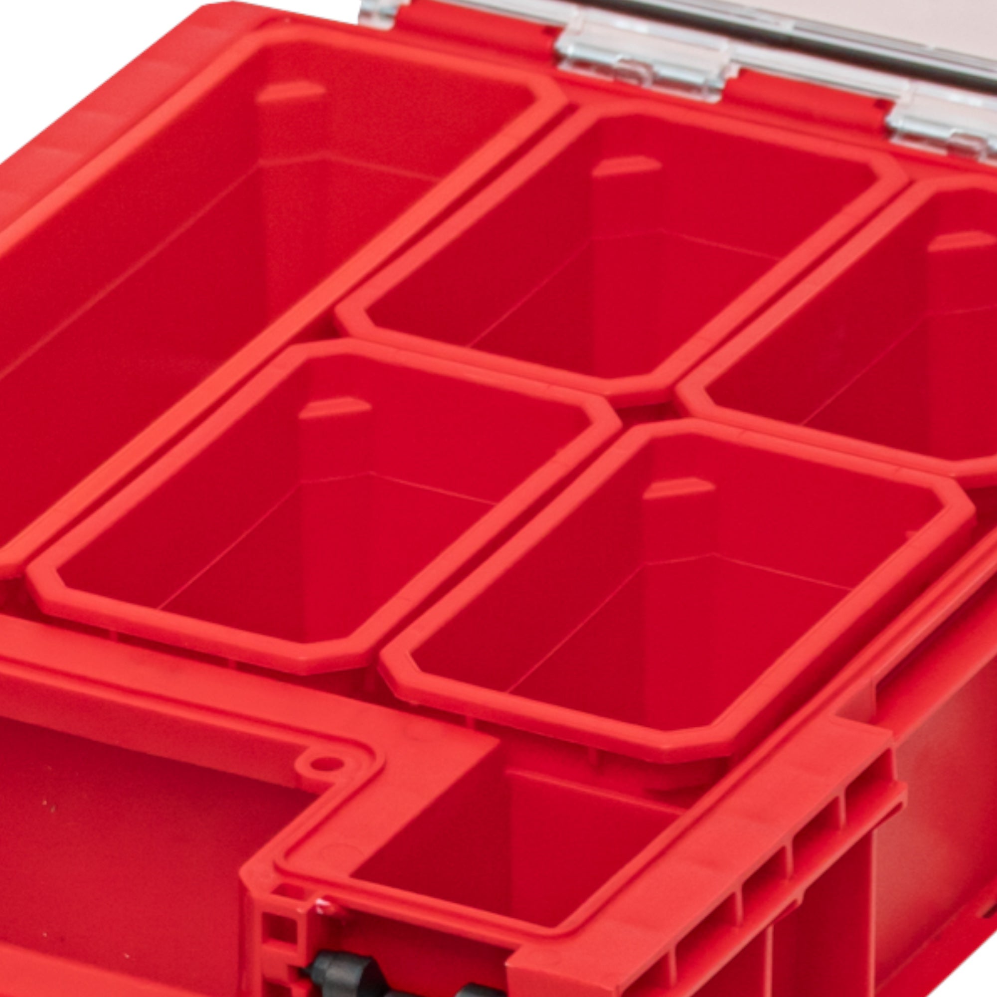 RED ULTRA HD ist eine Sonderedition von Qbrick System ONE-Produkten aus ultrabeständigem Kunststoff, der sich durch außergewöhnliche Beständigkeit gegen mechanische Beschädigungen auszeichnet. Die durchgeführten Schlagtests bestätigen seine außergewöhnliche Haltbarkeit, auch bei Bedingungen unter 0 °C. Qbrick System ONE Organizer M Plus ist ein höheres Modell des M-Organizers aus der Reihe der modularen ONE-Organizer, die in vielen Konfigurationen miteinander kombiniert werden können. Der Organizer M Plus verfügt über das patentierte Easy Access System, das dank spezieller Verbindungselemente einen einfachen Zugriff auf jedes Modul ermöglicht, ohne es lösen zu müssen, was die Arbeitsergonomie erheblich erhöht. Standardmäßig ist der Organizer M Plus mit 5 Eimern für Zubehör ausgestattet, darunter 4 kleinere und ein langer Eimer zum Aufbewahren und Transportieren der Längselemente Ihrer Werkstatt. Zusätzlich wird der Inhalt des Organizers durch eine flexible Dichtung, die in der Polycarbonatabdeckung angebracht ist, vor dem Eindringen von Wasser und Staub geschützt. Ein spezielles Organizer-Deckelschloss verhindert ein unkontrolliertes Herunterfallen.