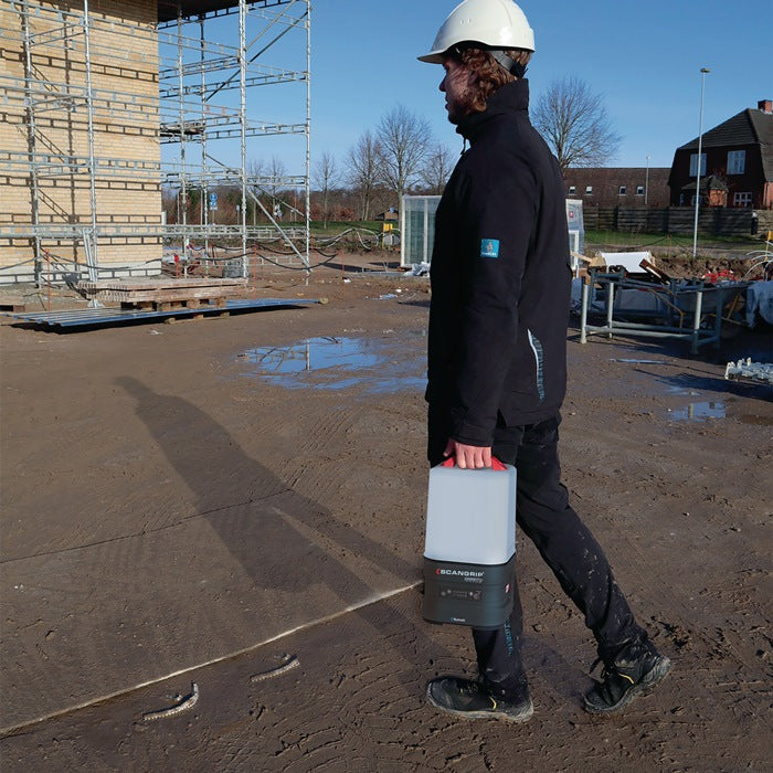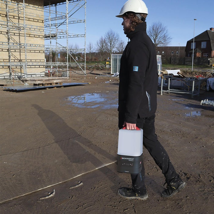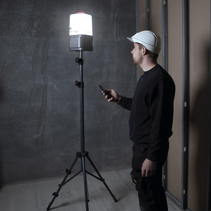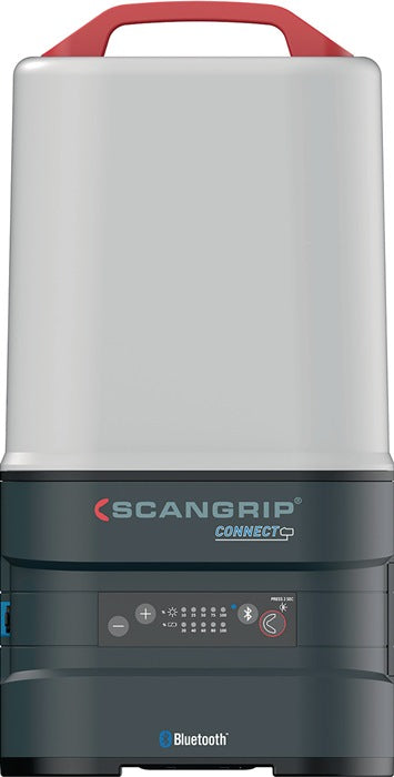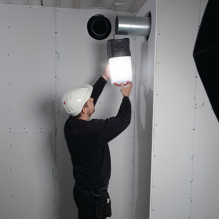 hocheffiziente 360°-Arbeitsleuchte mit 10.000 Lumen für 18-V-Akkupacks · diffuses und einheitliches Arbeitslicht · Abstrahlwinkel zwischen 180° und 360° wählbar · Dimmfunktion · Bedienung über BLUETOOTH Lichtsteuerungs-App möglich · Haken für flexible Platzierungsmöglichkeiten auf das SCANGRIP-TRIPOD · staub- und wasserdicht (IP65) · eingebaute Powerbank mit USB-Buchse · integrierter Reserveakku sichert extra Licht mit 1000 Lumen für 50 Minuten