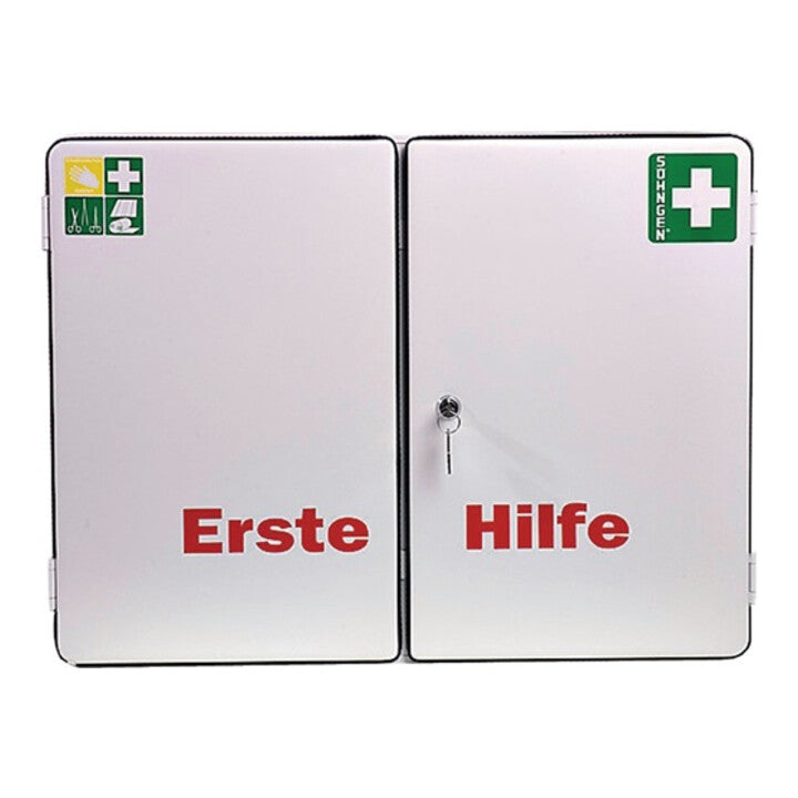 aus Stahlblech, weiß · 2-türig · Sicherheitsschloss, 2 Schlüssel · 4 Einlegeböden, 2 Schubladen · Türen mit je drei Ablageschalen · Montagematerial, zusätzlich klappbares Ablagetableau zur hygienischen Zwischenlagerung von Verbandmaterial bei der Erste Hilfe Leistung · erweiterbar durch 1 Medikamentenfach, 2 Zusatzböden und bis zu 4 Schubladen geeignete Füllung nach DIN 13169 s. Art.-Nr. 4000 386 103