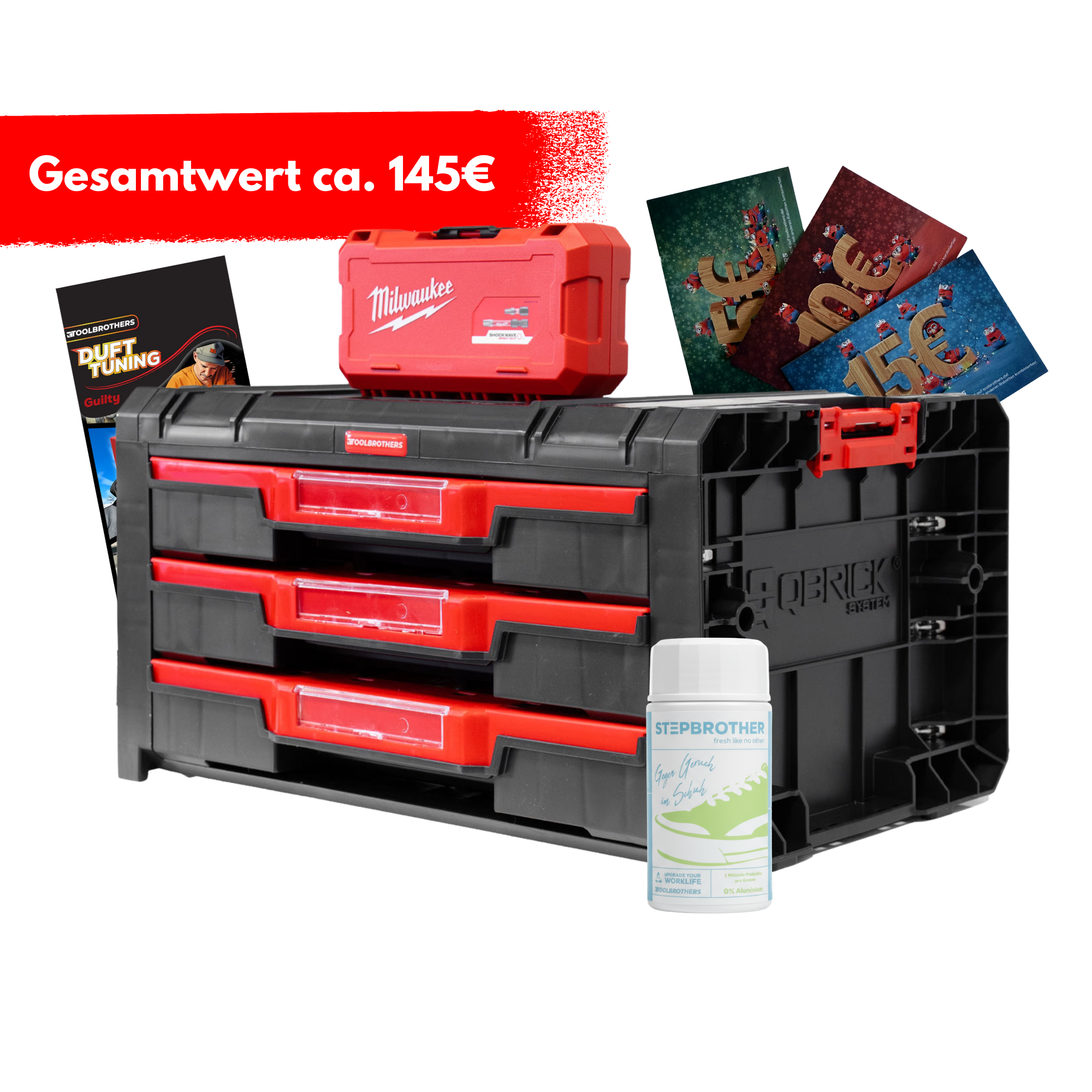 Der Kalender enthält ein 75-teiliges Milwaukee SHOCKWAVE Bit Set, den RHINO ECO Drawer 3 (der zur Toolbox wird), Toolbrothers STEPBROTHER Schuhdeo, einen limitierten Toolbrothers Duftbaum und Gutscheine im Gesamtwert von 30€ für toolbrothers.de.