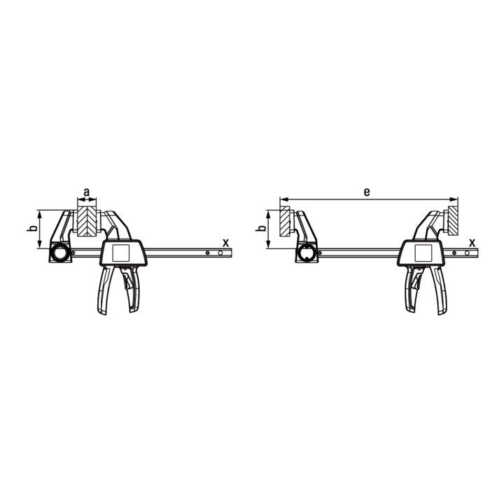 2-Komponenten-Kunstoffgriff mit Pumphebel und integriertem Lösehebel hinter der Schiene bis zu 2750 N Spannkraft (bei EZXL) · werkzeuglos umsteckbar zum Spreizen gummierte Schutzkappen mit Kreuzprisma für sicheren Halt von runden, spitzen und kantigen Teilen