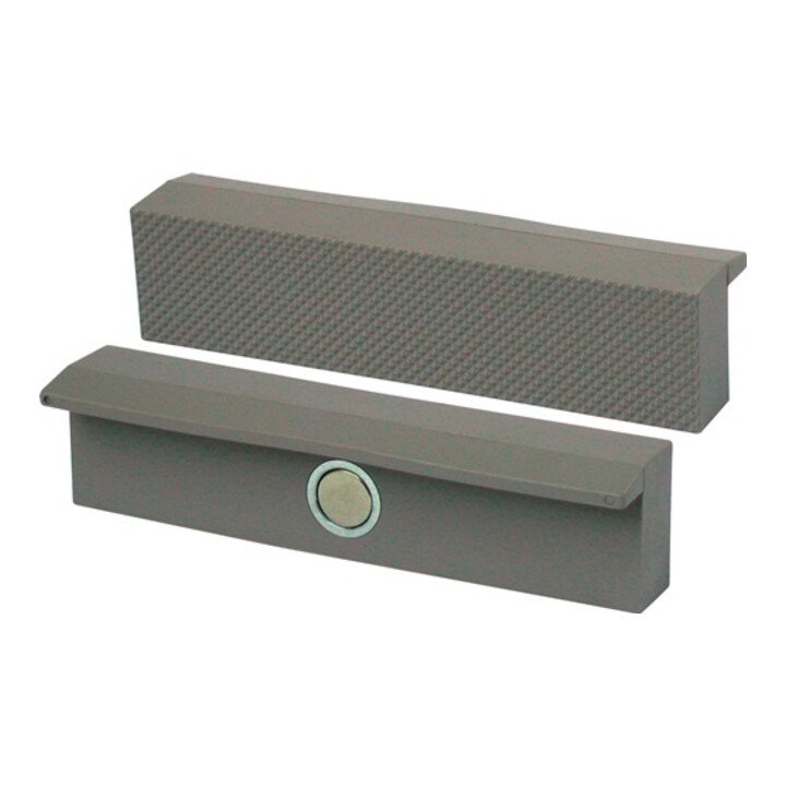 aus Polyurethan · zum Spannen von empfindlichen Werkstücken · mit äußerst kräftigem Neodym Flachmagnet, welcher fest in der Backe verpresst ist und sich auch nach langer Benutzung nicht löst · der Magnetismus dringt nicht zu der vorderen Spannfläche vor · passend für alle Schraubstocktypen · Besondere Produktvorteile: Die Backen sind aus Polyurethan. Dieses sehr elastische, widerstandsfähige und alterungsbeständige Material nimmt nach Verformung durch Druck die ursprüngliche Form wieder an. Typ PP (Polyurethan Prismen): Spannen von empfindlichen runden und ovalen Werkstücke. Durch die eingearbeiteten Prismen in unterschiedlicher Größe werden die Werkstücke sicher gehalten Typ PR (Polyurethan Riffel): Spannen von empfindlichen Werkstücken aller Art. Die Riffelung greift in die Oberfläche der Werkstücke ein, ohne sie zu beschädigen