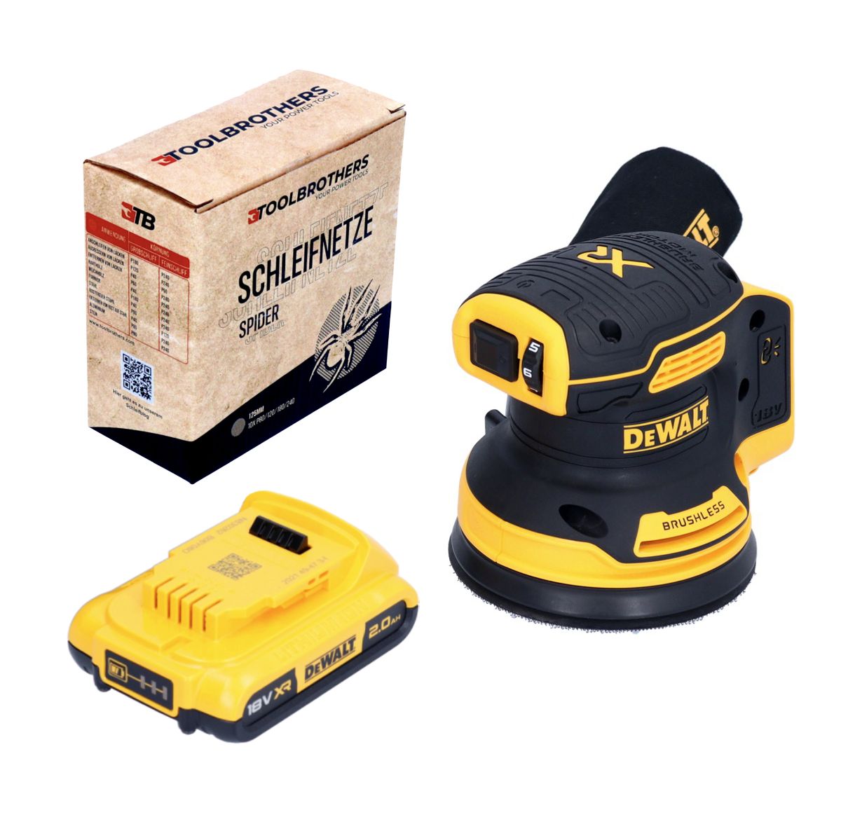 DeWalt DCW 210 N Akku Exzenterschleifer 18 V 125 mm Brushless + 1x Akku 2,0 Ah + 1x Toolbrothers SPIDER Schleifnetz Set - ohne Ladegerät