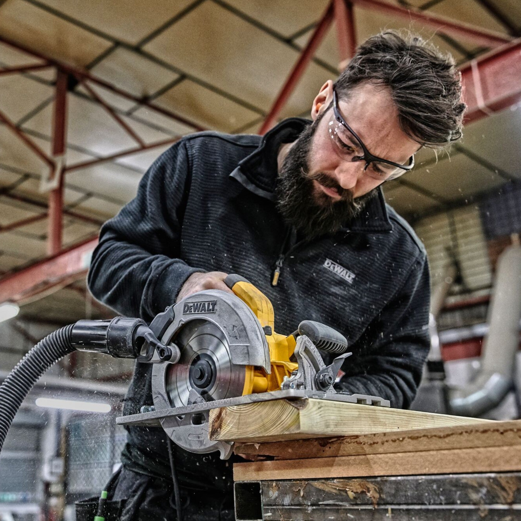 Die DeWalt DWE 576 Handkreissäge ist eine leistungsstarke und präzise Säge, die sich ideal für anspruchsvolle Schnitte und professionelle Anwendungen eignet. Dank Justierschrauben sowie 90° und 45° Führungsnuten lässt sie sich optimal auf der DeWalt Führungsschiene befestigen und führen, was für exakte und wiederholbare Schnitte sorgt. Der verwindungssteife Sägeschuh gewährleistet eine hohe Stabilität und passt perfekt auf das neue DeWalt Führungsschienen-System. Mit einer Schnitttiefe von bis zu 62 mm (bzw. 57 mm mit Führungsschiene) bietet die kompakte und ausbalancierte Konstruktion höchste Präzision und müheloses Handling. Die integrierte Schutzhaube mit Staubabsaugung sorgt für eine saubere Arbeitsumgebung und reduziert die Staubbelastung während des Sägens. Für noch mehr Sicherheit und Kontrolle ist die Handkreissäge mit einem Zusatzhandgriff ausgestattet, der ein sicheres Zweihand-Arbeiten ermöglicht. Angetrieben von einem leistungsstarken Motor mit hohem Drehmoment, liefert die DWE 576 K zuverlässige Leistung für verschiedenste Anwendungen – von präzisen Längs- und Gehrungsschnitten bis hin zu robusten Sägearbeiten auf der Baustelle.