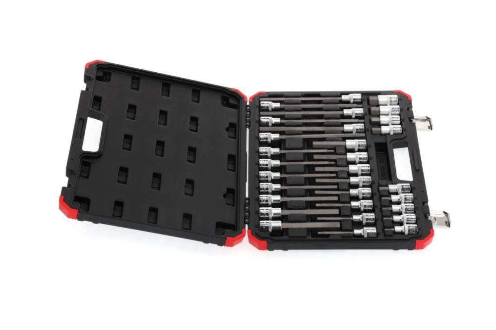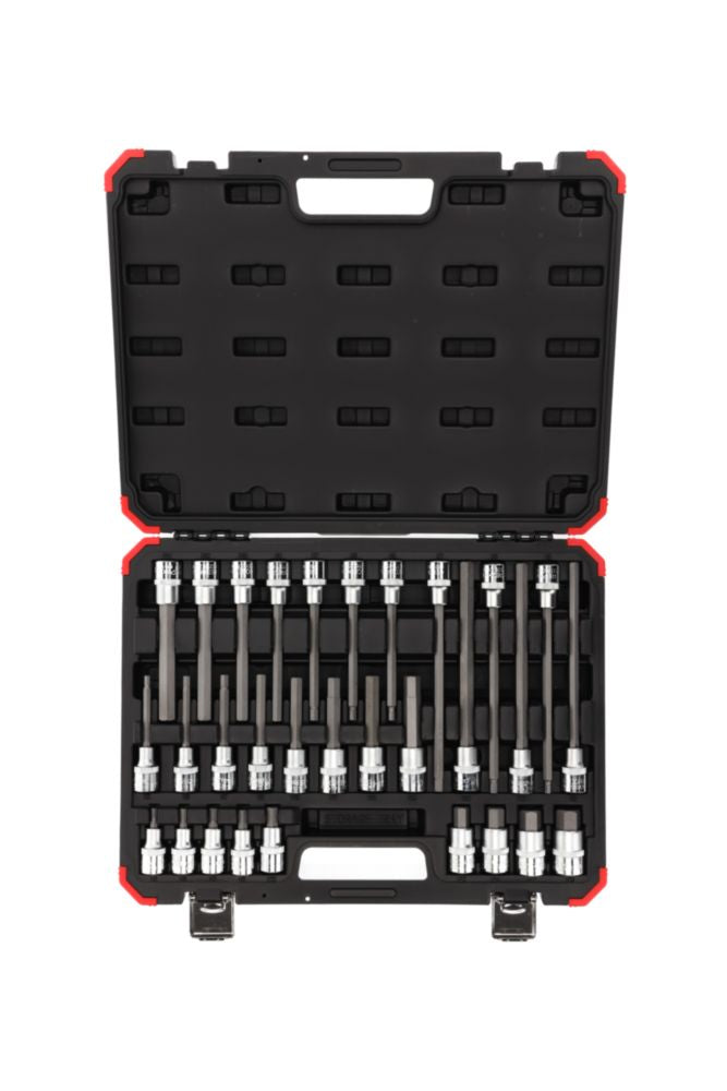 12,5 mm (1/2 ″)-Vierkantantrieb · Schraubeinsätze mit CV-Stahl-Sockel und Klinge aus Spezialstahl phosphatiert Inhalt: je 1 Steckschlüssel-Einsatz für Schrauben mit Innensechskant-Profil 5 / 6 / 7 / 8 / 10 / 12 / 14 / 17 / 19 mm (L. 55 mm) je 1 Steckschlüssel-Einsatz für Schrauben mit Innensechskant-Profil 5 / 6 / 7 / 8 / 10 / 11 / 12 / 13 mm (L. 100 mm) je 1 Steckschlüssel-Einsatz für Schrauben mit Innensechskant-Profil 5 / 6 / 7 / 8 / 10 / 12 / 14 mm (L. 140 mm) je 1 Steckschlüssel-Einsatz für Schrauben mit Innensechskant-Profil 5 / 6 / 7 / 8 / 10 / 12 mm (L. 200 mm)