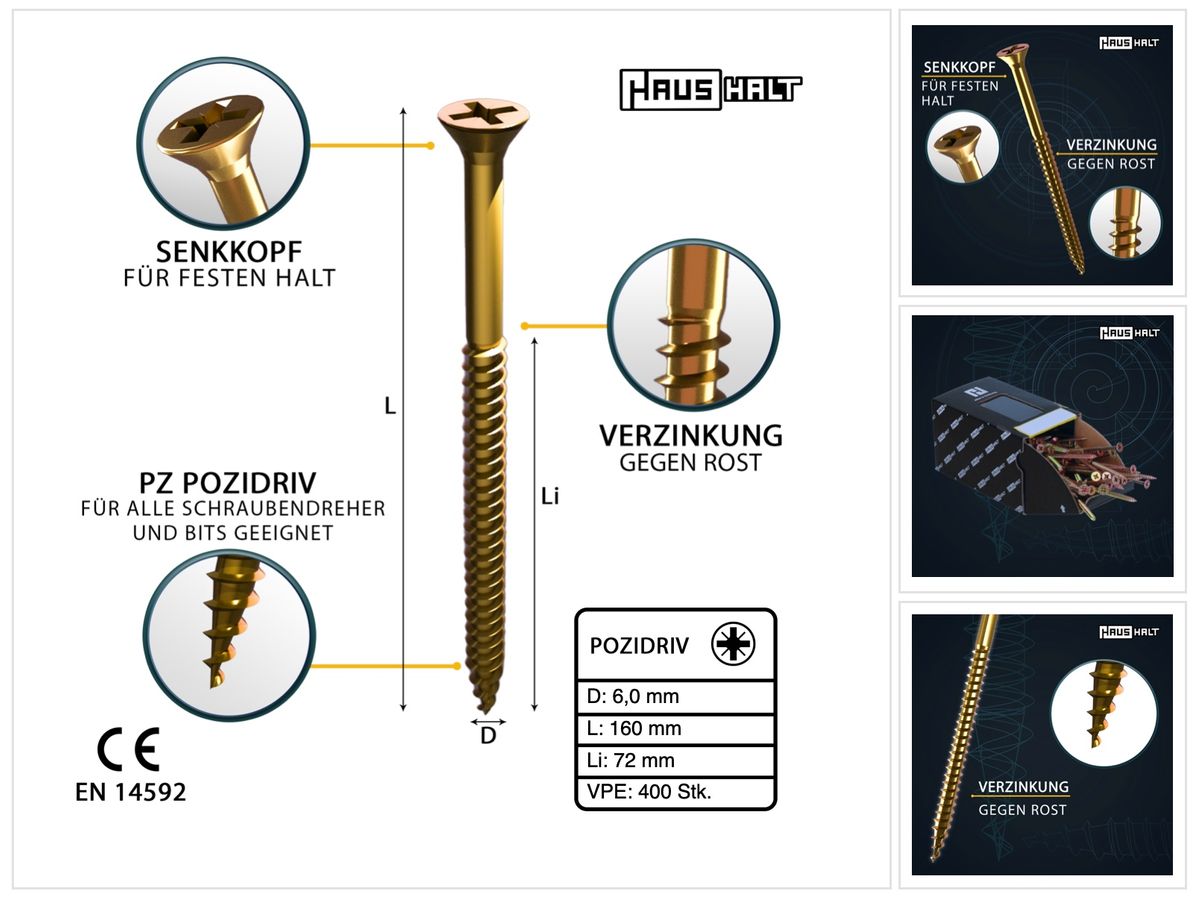 HausHalt Universal Holzbauschraube Holzschraube 6,0 x 160 mm PZ3 400 Stk. ( 4x 000051371220 ) gelb verzinkt Kreuzschlitz Pozidriv Senkkopf Teilgewinde