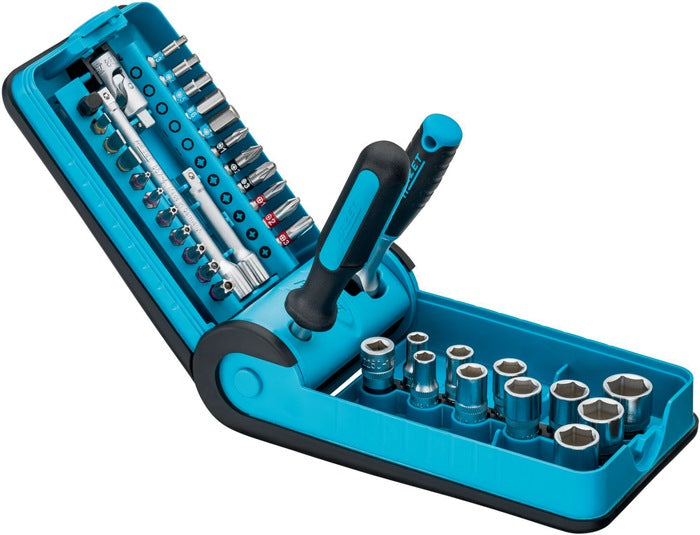 - 1 HiPer Feinzahn-Umschaltknarre (90 Zähne) (statisches Drehmoment nach DIN 3122: bis zu 120 Nm - Rückschwenkwinkel nur 4° je 1 6-kant-Steckschlüssel-Einsatz SW 5,5 / 6 / 7 / 8 / 9 / 10 / 11 / 12 / 13 / 14 mm je 1 Verlängerung L. 55 / 101,5 mm 1 Steckgriff mit Vierkant L. 134 mm je 1 Bit für Schlitzschrauben Gr. 4,5 / 6,5 / 8 mm je 1 Bit für Schrauben mit Kreuzschlitz (PH) Gr. 1 / 2 / 3 je 1 Bit für Schrauben mit Kreuzschlitz (PZ) Gr. 1 / 2 / 3 je 1 Bit für Schrauben mit Innensechskant-Profil Gr. 3 / 4 / 5 / 6 / 7 je 1 Bit für Schrauben mit Innen-TORX®-Profil und Sicherungsstift Gr. T 10 / 15 / 20 / 25 / 27 / 30 / 40 1 Kardangelenk 1 Adapter 6,3 mm (1/4 ʺ)-Innenvierkant auf 6,3 mm (1/4 ʺ) Innensechskant 1 Adapter 6,3 mm (1/4 ʺ)-Außenvierkant auf 6,3 mm (1/4 ʺ) Außensechskant Lieferung in Kunststoffkasten mit Antirutschbeschichtung