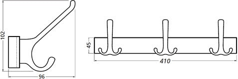 Leichtmetallhaken · silberfarbig eloxiert · montiert auf Profilleiste · 2 verdeckte Befestigungsaufnahmen auf der Rückseite (Lieferung ohne Schrauben oder Dübel !) · Ausladung 96 mm · Höhe 102 mm