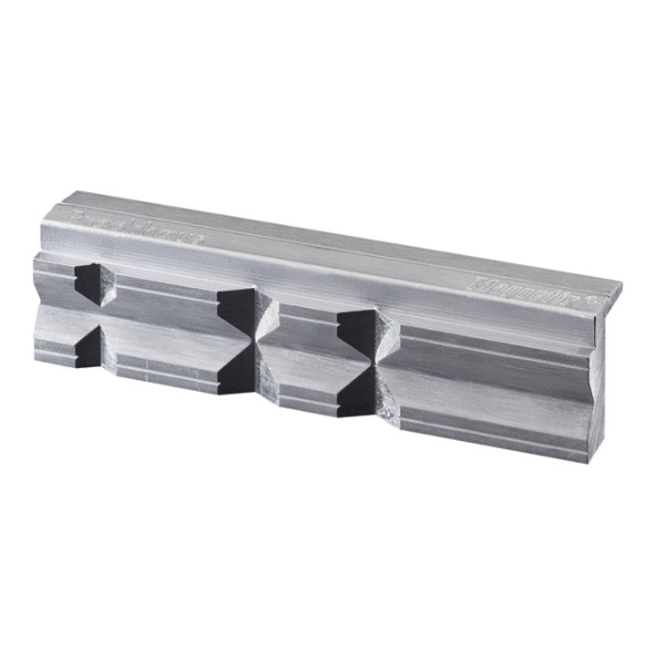 aus Aluminium mit Prismen · zum Spannen von Werkstücken in verschiedensten Formen · mit äußerst kräftigem Neodym Flachmagnet, welcher fest in der Backe verpresst ist und sich auch nach langer Benutzung nicht löst · der Magnetismus dringt nicht zu der vorderen Spannfläche vor · passend für alle Schraubstocktypen · Besondere Produktvorteile: Die Backen sind aus Aluminium in der Härte zwischen Kupfer und Blei. Ein waagerechtes Prisma und drei unterschiedlich große senkrechte Prismen in beiden Backen ermöglichen das Spannen von runden und ovalen Werkstücken. Die 90°-Einfräsung im oberen Teil der Backen ermöglicht das problemlose waagerechte Spannen von Flachmaterial. VE = 1 Paar
