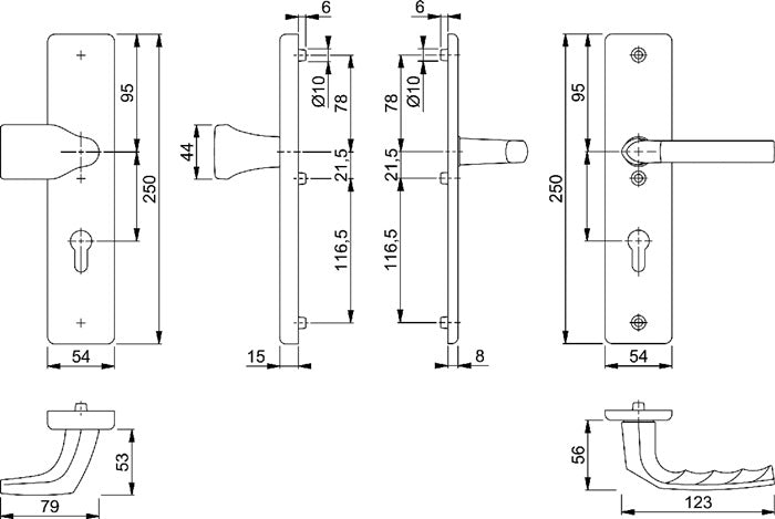 Wechselgarnitur für Abschlusstüren · Zamak-Unterkonstruktion im Außen- und Innenschild · mit feststehendem Knopf · Profilstift-Verbindung · sichtbare Verschraubung · Lochung PZ · Aluminium · Randhöhe Schild: 15 mm · DIN links / rechts · Widerstandsklasse ES 0