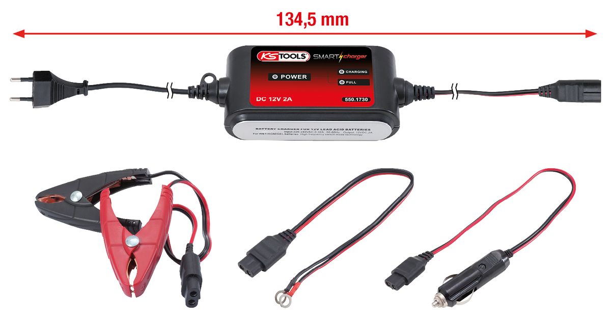 - inklusive 3 Anschlusskabel (Zigarettenanzünder, M6 Ringösenkontakt, Krokodilpolklemmen)