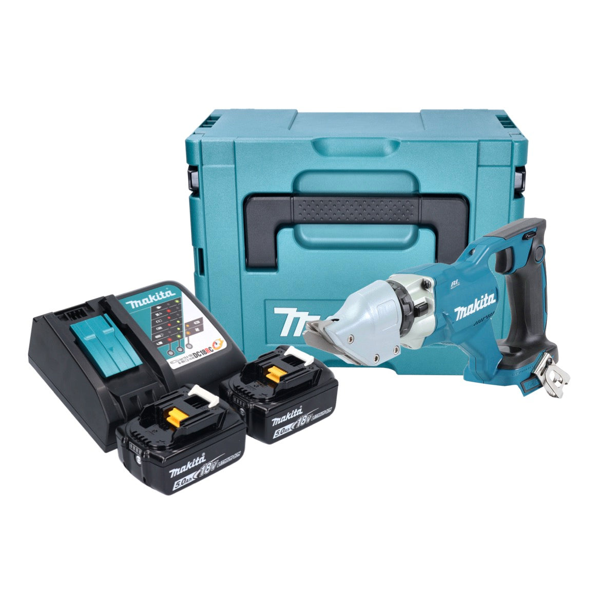 Makita DJS 200 RTJ Akku Blechschere 18 V 2,0 mm Brushless + 2x Akku 5,0 Ah + Ladegerät + Makpac