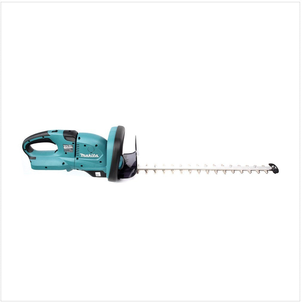 Die Akku-Heckenschere DUH 651 aus dem Hause Makita überzeugt mit ihrem leistungsstarken 36V - Motor (2x18V) und einem ergonomischen und drehbaren Griff. Dieser ermöglicht eine Arretierung bei 0°, 45° und 90°, wodurch stets eine optimale Haltung beim Arbeiten möglich wird. Die Heckenschere arbeitet sehr leise, wodurch in besonders lärmempfindlichen Bereichen gearbeitet werden kann. Die optimal ausgewogene Gewichtsverteilung reduziert Ermüdungserscheinungen in Unterarm und Händen. Des Weiteren ist die DUH 651 mit einem Sanftanlauf, einer Motorbremse und einem rostfreien Messer ausgestattet. Die Hubzahl lässt sich elektronisch regeln.
