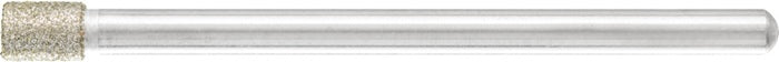 Zylinderform · galvanisch gebundenes Diamantwerkzeug zum Schleifen von Bohrungen, Radien und Konturen im stationären und im Handeinsatz · zur Bearbeitung von Hartmetall, Glas, Keramik, Porzellan, feuerfesten Werkstoffen, Ferrit, Silicium, Graphit, Gummi usw. · Schleifstifte ab einem Durchmesser von 8 mm haben eine Aussparung an der Stirnfläche · empfohlene Umfangsgeschwindigkeit Vc = Trockenschliff 8 - 18 m/s Nassschliff 15 - 25 m/s