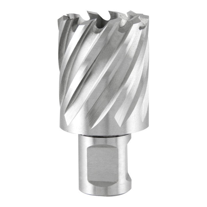 Kernbohrer aus Hochleistungs-Schnellarbeitsstahl. Geeignet für Stahl (wie z.B. T-Träger, großforma­tige Bleche), Stahlguß, Bunt- und Leichtmetalle.