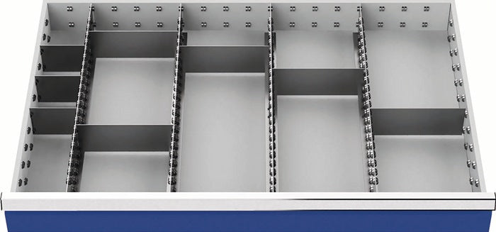 Metalleinteilung für Fronthöhe 200 mm · für Schubladen-Innenmaße B 900 x T 600 mm · 4 Längstrennwände · 8 Quertrennwände