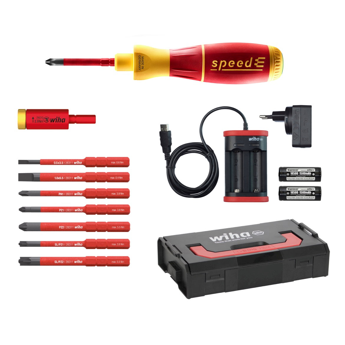 Wiha speedE® Set 2 E-Schraubendreher mit 2x Akku 1,5Ah + Ladegerät + 8x slimBits + TorqueAdapter 2,8Nm + L-Boxx ( 41912 )