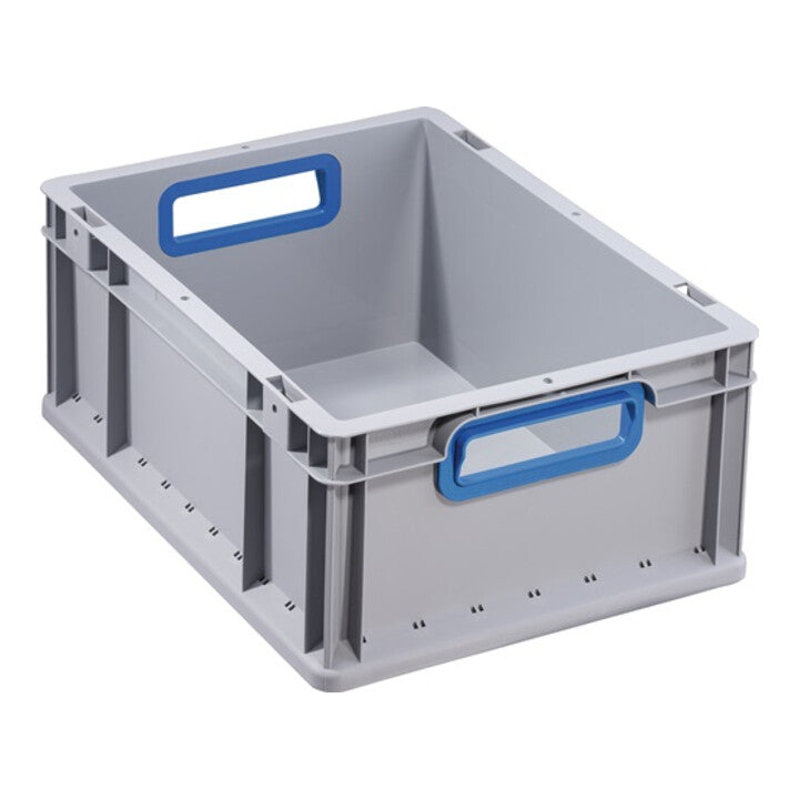 grey - dimensionally stable polypropylene - rib-reinforced walls - adapted to Euro pallet dimensions - self-centring, all-round stacking rim - optimum cleaning thanks to smooth inner walls - resistant to most acids and oils - temperature-resistant from -10 °C to +60 °C - closed walls - blue, open handle
