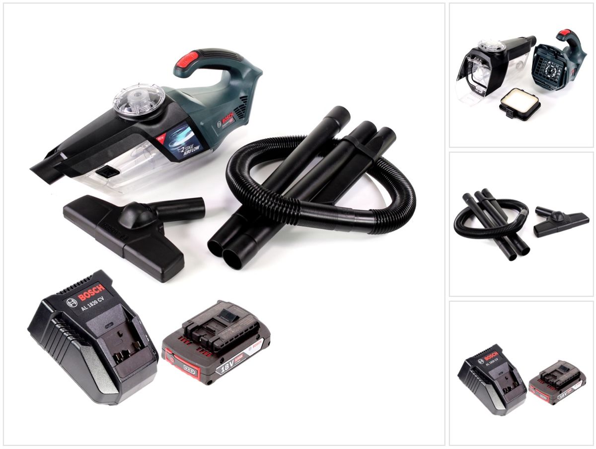Bosch GAS 18 V Li-Ion Akku Staubsauger Hand Sauger + 1x GBA 18 V 2,0 Ah Einschub Akku + 1x AL 1820 CV Schnellladegerät 14,4V - 18V