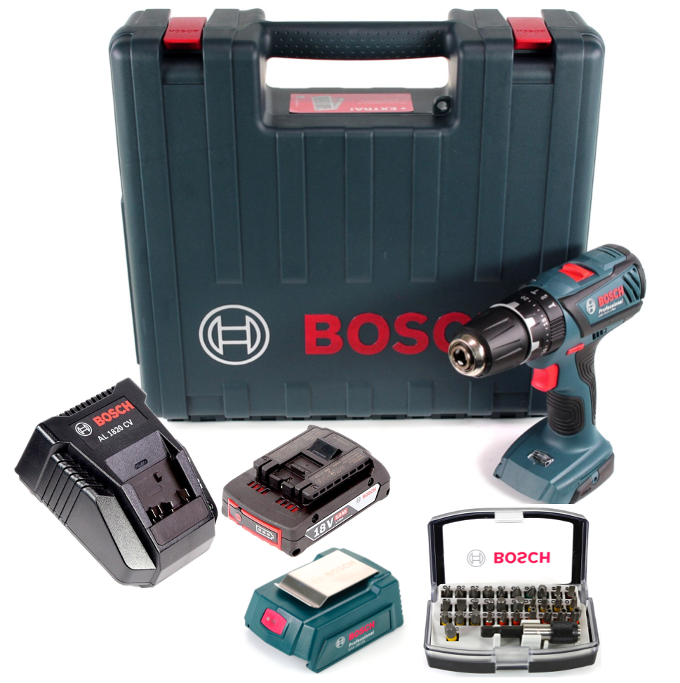 Bosch GSB 18-2-LI Plus Professional Cordless Combi Drill 18 V + 1x Battery GBA 2.0 Ah + 1x Quick Charger Bosch AL 1820 CV + Carry Case + 32x Screwdriver Bits Bosch + 1x USB charger adapter for 18 V Battery
