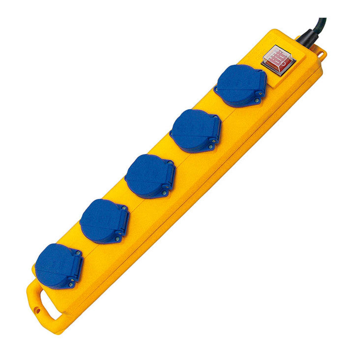 with splash-proof socket outlets in impact-resistant and break-proof plastic housing with large, wide contact surface - the socket outlets are conveniently spaced and equipped with sealing rings and self-closing hinged lids - socket outlets in a practical 45° arrangement (for convenient use of angled plugs) - illuminated 2-pole switch with protective cover - with very sturdy bracket for hanging and fastening - H07RN-F rubber cable - approved for permanent outdoor use