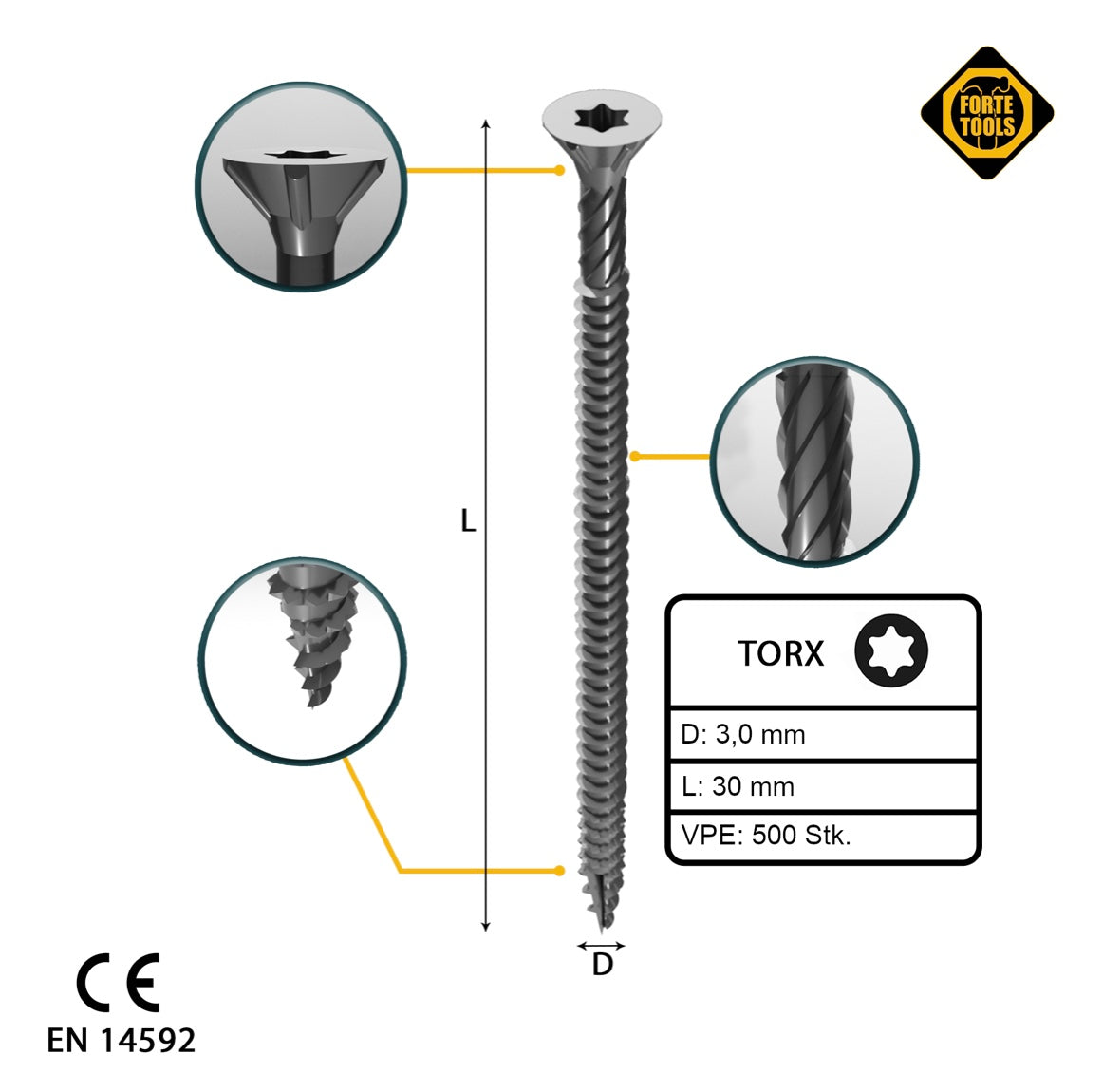 - 500x FORTE Tools Universal Holzschraube 3,0 x 30 mm T10