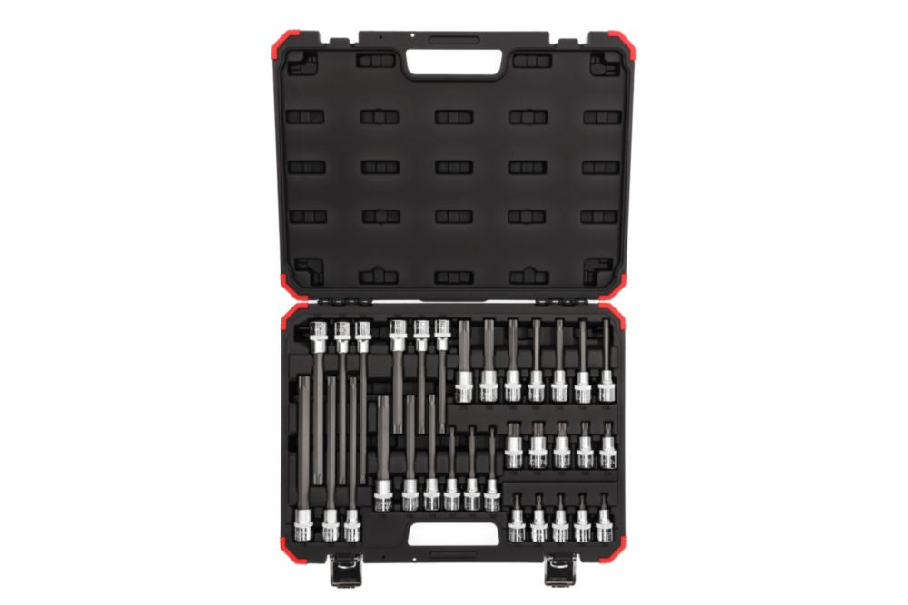 12.5 mm (1/2″) square drive - Screw sockets with CV steel base and blade made of phosphated special steel Contents: 1 socket spanner socket for screws with internal TORX® profile size T 20 / 25 / 27 / 30 / 40 / 45 / 50 / 55 / 60 / 70 (L. 55 mm) 1 socket spanner socket for screws with internal TORX® profile size T 20 / 25 / 27 / 30 / 40 / 45 / 50 / 55 / 60 / 70 (L. 100 mm) 1 socket spanner socket for screws with internal TORX® profile size T 40 / 45 / 30 / 40 / 45 / 50 / 55 / 60 / 70 (L. 100 mm) T 20 / 25 / 27 / 30 / 40 / 45 / 50 / 55 / 60 / 70 (L. 100 mm) 1 socket spanner bit for screws with internal TORX® profile size T 40 / 45 / 50 / 55 / 60 / 70 (L. 140 mm) 1 socket spanner bit for screws with internal TORX® profile size T 40 / 45 / 50 / 55 / 60 / 70 (L. 200 mm)