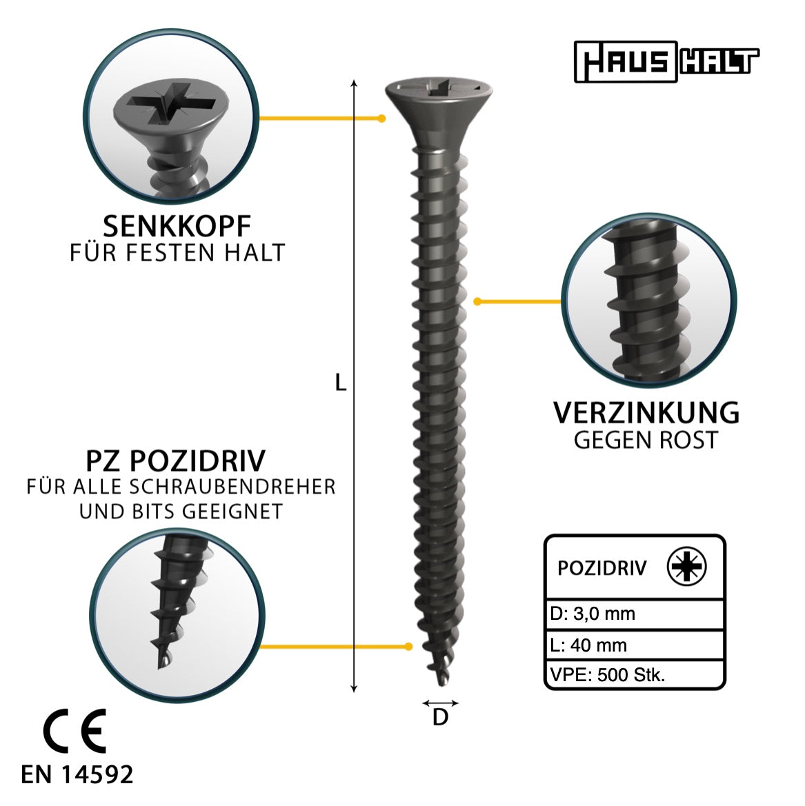 - 500x HausHalt universal wood building screw wood screw 3.0 x 40 mm PZ1