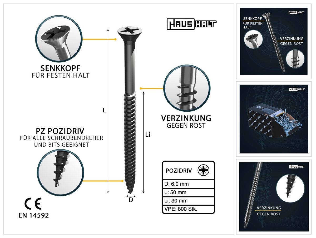 - 800x HausHalt universal wood building screw wood screw 6.0 x 50 mm PZ3