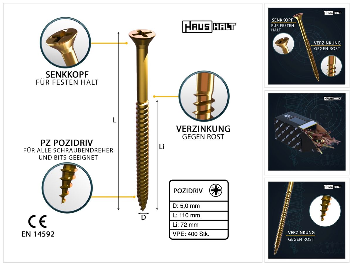 - 400x HausHalt Universal Wood Screws 5.0 x 110mm - PZ2 (4x 000051371184)