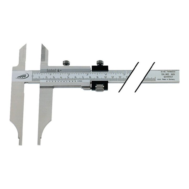 with blade tips - scale and vernier matt chrome-plated - graduation and scaling highly accurate thanks to laser labelling - main graduation lowered - internal and external measurement Hole size attachment for internal measurements: up to 300 mm Measuring range = 10 mm 500 - 1000 mm Measuring range = 20 mm