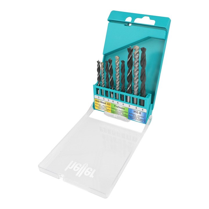 for stone, metal and wood - contains the most common drill bits for wood, metal and stone applications Contents: 1 pc. masonry drill bit Ø 5, 6, 8 mm 1 pc. HSS drill bits, roll-rolled Ø 5, 6, 8 mm 1 each Wood drill bit Ø 5, 6, 8 mm