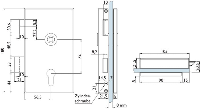Molina 105 Technical details : Basic lock tested to DIN EN 18251 Class 3 - Whisper latch - 2-part special clamping follower - Screwed lock covers made of stainless steel or aluminium - Accessory bag with lever handle guide 16 + 18 mm incl. covers in lock colour - With this lock type, specification left or right is required. covers in lock colour - this lock type requires the specification left or right - with the new LowNoise version, the locks are even more convenient for use in the professional sector - a newly designed interior of the lock, together with the existing latch with plastic insert, enables a quiet, silent locking process - supplied without lever handles and hinges - please order separately!