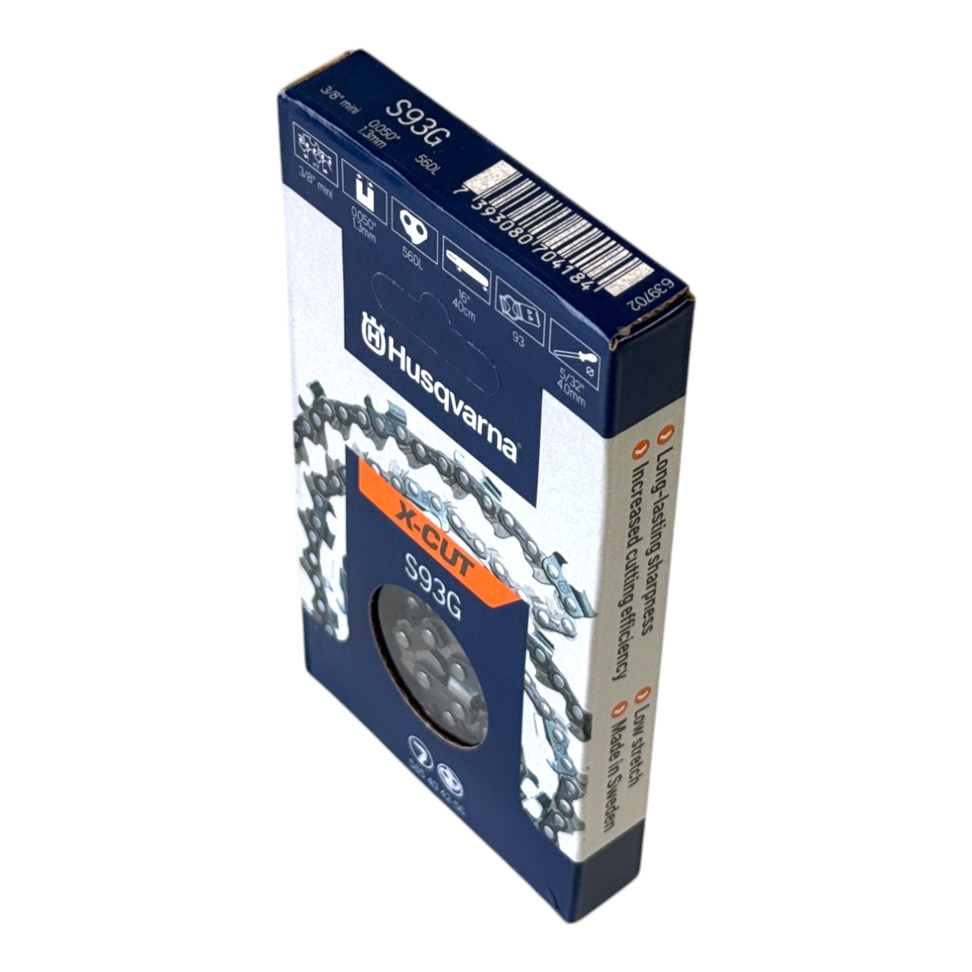 Designed specifically for arborists and tree care professionals, the Husqvarna X-CUT S93G saw chain delivers excellent precision and performance - even in tight places. Its smooth handling, long-lasting sharpness and low recoil guarantee high efficiency and improved manoeuvrability, while reducing strain on the user. Thanks to the rounded cutting elements (S), the chain stays sharp longer, is easier to maintain and less sensitive to filing angles or dirt. This makes it the ideal choice for professionals and hobby users alike. The protected drive link (G) minimises the risk of kickback and ensures safe and controlled guidance of the chain. The X-CUT® chains are supplied sharpened ex works so that they are ready for immediate use. The precise grinding process ensures razor-sharp edges and outstanding cutting efficiency. They are also pre-tensioned, reducing the need for frequent readjustments and minimising the risk of damage to the cutting system from a loose chain. A practical gold-coloured binding band makes it easy to identify the start and end of filing the chain, which greatly simplifies maintenance.