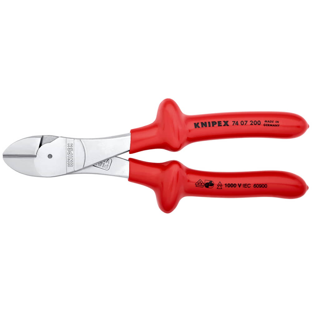 VDE-insulated up to 1000 V - manufactured in accordance with DIN EN/IEC 60900, piece-tested - 20 % less force than conventional diagonal cutters - cutting edges additionally induction-hardened, cutting edge hardness approx. 64 HRC - chrome vanadium high performance steel, forged, multi-stage oil-hardened pliers chrome-plated