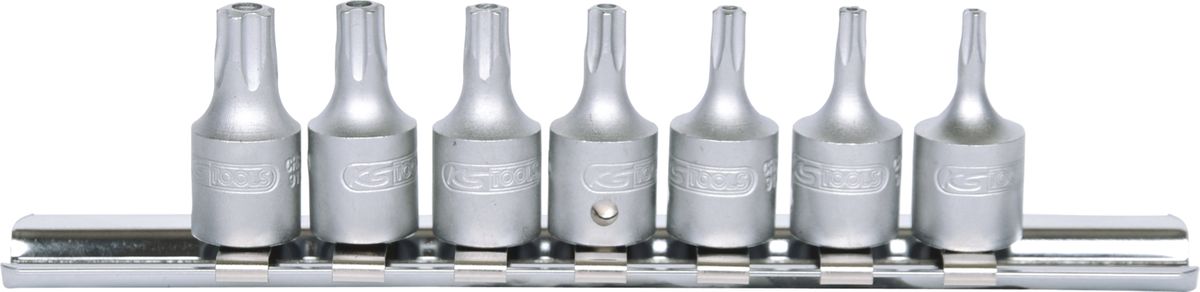 Produktbeschreibung:1/4" Bit-Stecknuss-Satz für Fünfstern-Schrauben, 7-tlg mit Stirnlochbohrung ·