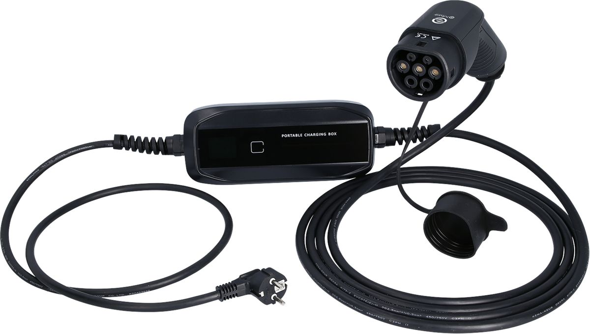 efuturo mobile Ladestation mit Typ 2 Ladekabel, 1 Phase, bis zu 3,7 kW, bis zu 16 A, 230 V, Mode 2, LCD Display, Schuko-Stecker · efuturo mobile Ladestation mit Typ 2 Ladekabel, 1 Phase, bis zu 3,7 kW, bis zu 16 A, 230 V, Mode 2, LCD Display, Schuko-Stecker
